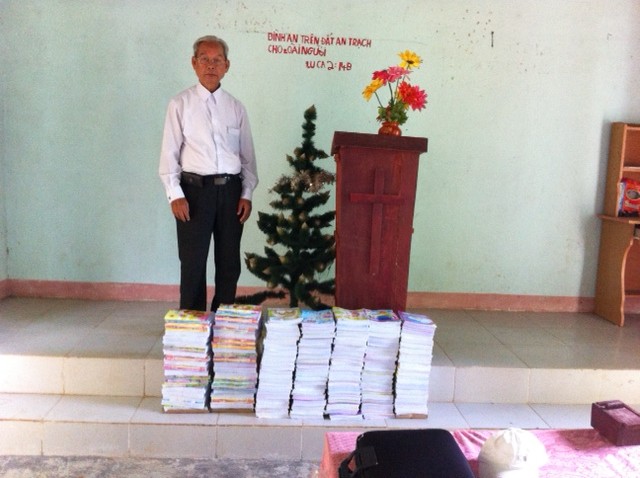 Trong số 700 tập vở này có dành 200 tập để tặng cho 20 em hs nghèo của trường Tiểu học Sơn Thành tại địa phương.