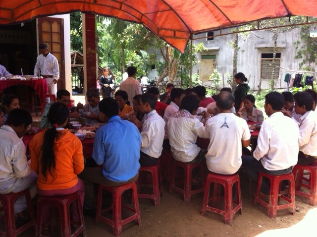 các bửa ăn được tiếp đón trong rạp dựng tạm có sức chứa 4 bàn ăn cho khoản 40 người trước phòng nhóm.
